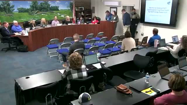 District staff gave an extended presentation on a state workforce 'CAP' grant awarded for agri‑technology, explaining how the district will prioritize facility upgrades, professional learning and equipment purchases for career‑tech programs.