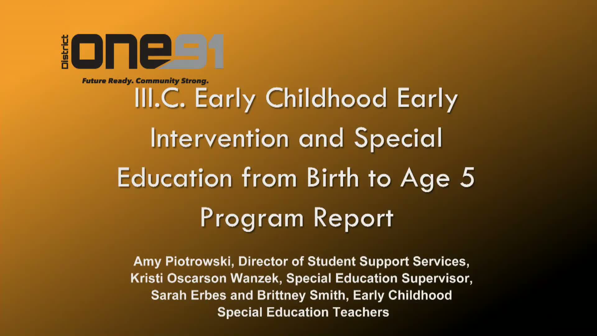 The district's ECSE team told the ISD 191 board that early intervention is legally mandated under IDEA; presenters reported about 303 active early-intervention identifications, 65 students in VPK, growth in referrals, staff composition, and described the 45-calendar-day evaluation timeline and family-centered coaching model.