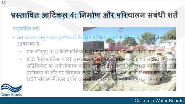 State Water Board staff detailed proposed construction and installation requirements in Article 4 of the draft rewrite. The changes include mandatory manways installed in accordance with manufacturer instructions or recognized engineering standards, labeling requirements (manufacturer identification, production date, maximum burial depth, maximum test pressure and notation of striker-plate-free openings), and markings within the sub-collar for easier post-installation verification.