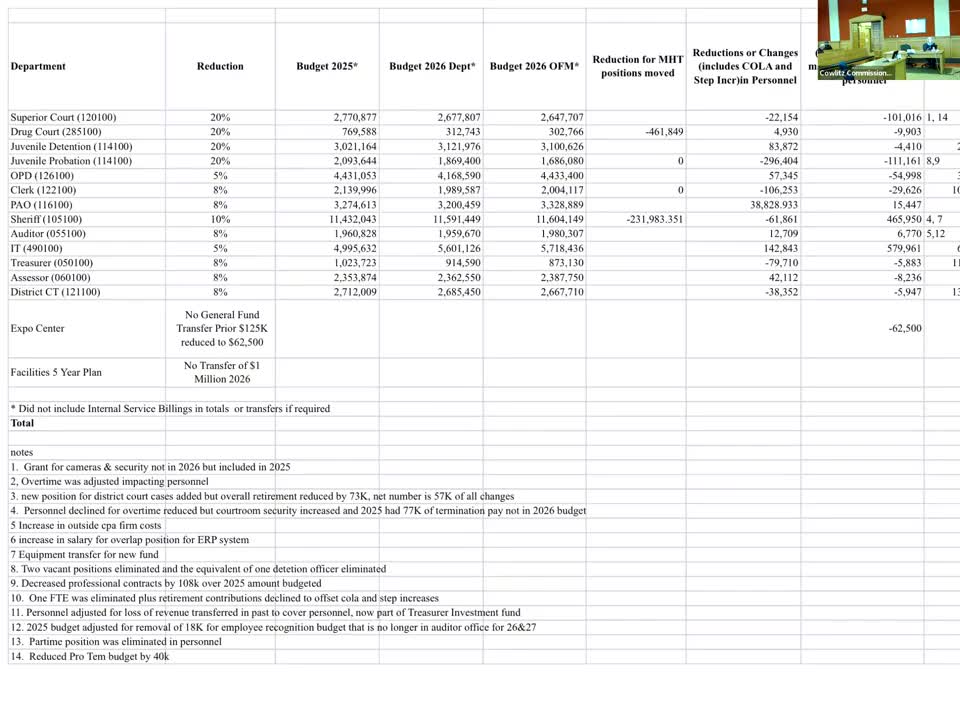 COWLITZ COUNTY — Commissioners opened a budget workshop Tuesday to consider proposed reductions to the 2026 budget and strategies to prevent a projected 2027 deficit that finance staff said would require roughly $8 million in additional cuts or new revenues.