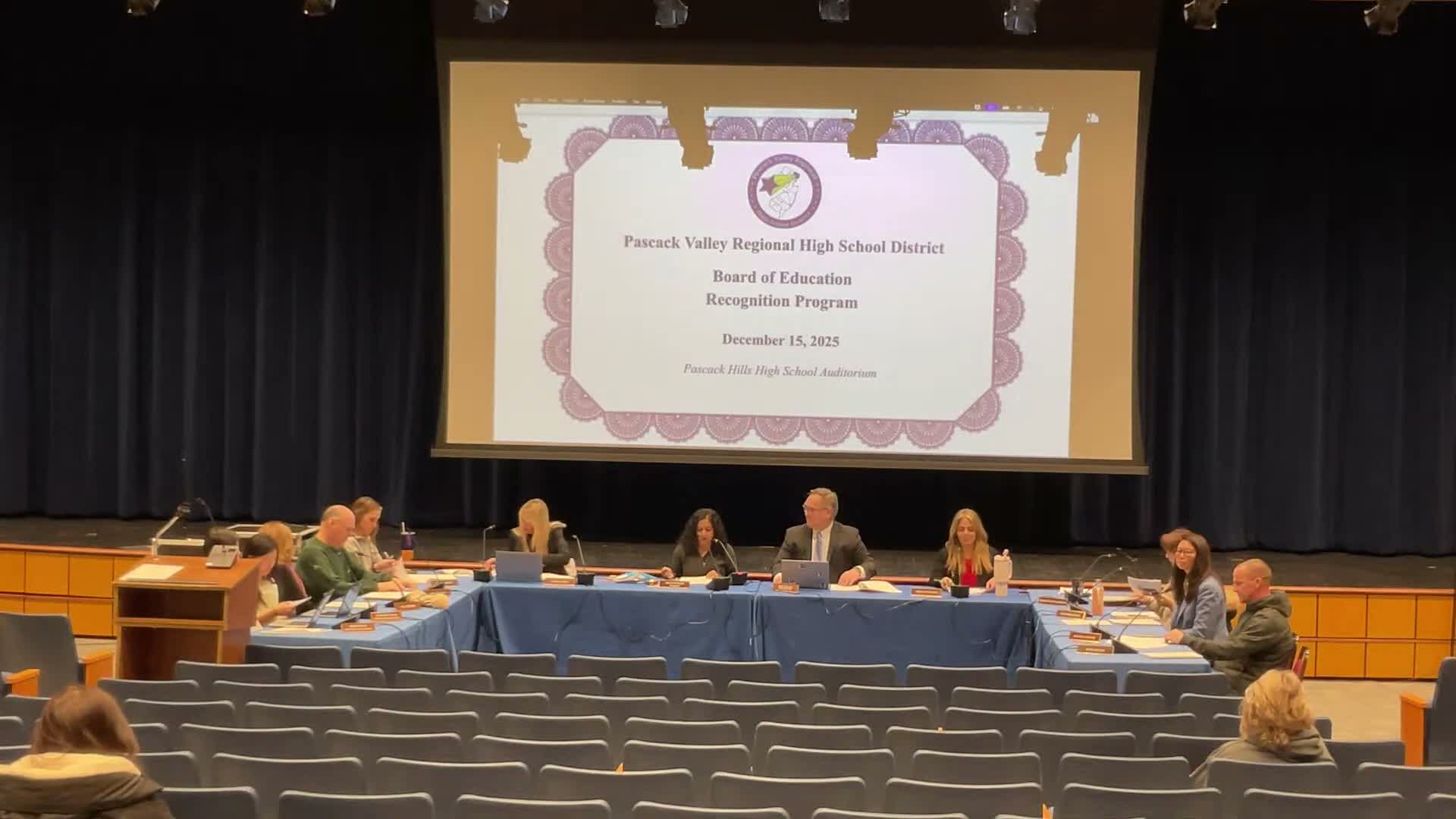 The board recognized Adam Shaw, a senior at Pascack Valley High School, as the Bergen Record Athlete of the Week for Sept. 4, 2025, noting Shaw finished his career with 2,436 passing yards and 20 touchdowns and was highlighted for his performance against Union City. "Now therefore be it resolved that the Pascack Valley Regional High School District Board of Education recognizes and commends Adam for his outstanding achievement," a board representative read.