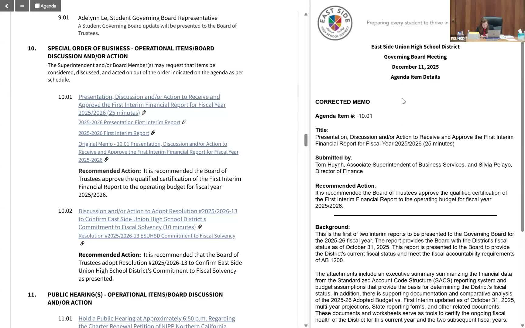 The East Side Union High School District board received a qualified first interim financial report on Thursday and voted unanimously to adopt a revised fiscal solvency resolution designed to shore up reserves.