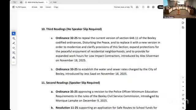Bexley City Council on Dec. 16 adopted Ordinance 33-25 to set the city—s 2026 water and sewer rates, passing through increases imposed by the City of Columbus.