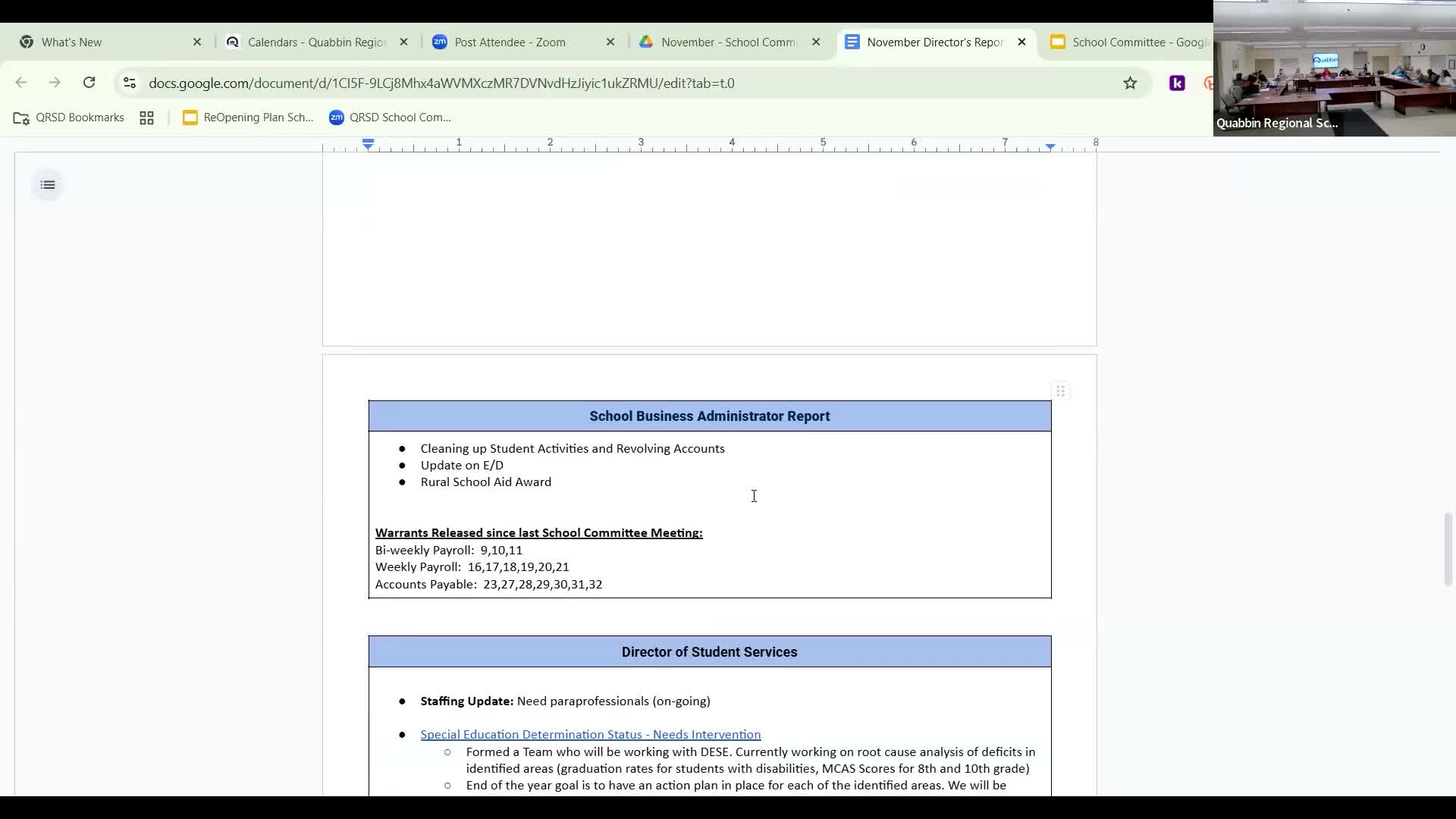 Quabbin school committee approves DECA/school‑store revolving account, moves student activity funds and notes $81,200 rural aid shortfall