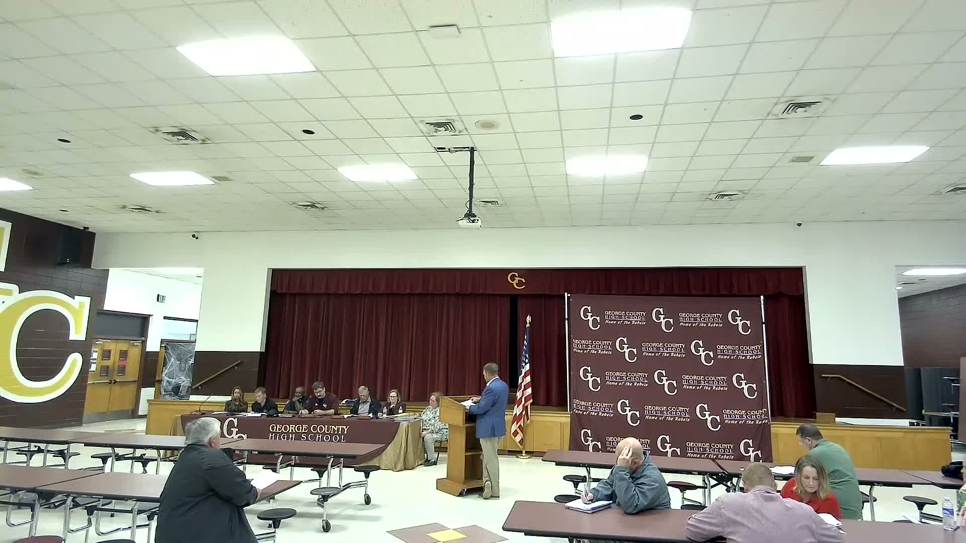 At a regular meeting the George County School District board approved a new SPED bus route and vehicle purchases, authorized a recurring camera-licensing contract, approved a special-education project application, and appointed Jake Davidson as interim District 2 board member after an executive session.