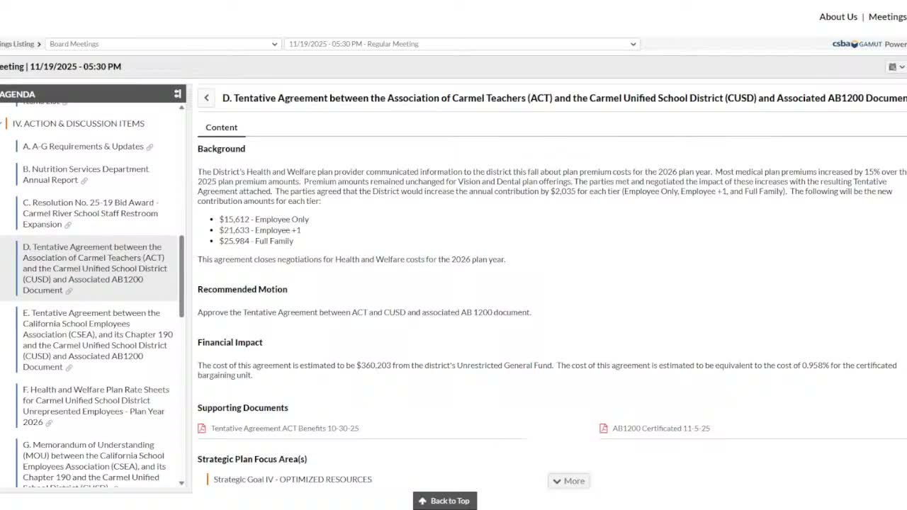 Chief Human Resources Officer Craig Chavez presented agreements reached with bargaining units after negotiations that reflected increases to district contributions for employee health and welfare plans. The board moved and voted to approve the tentative agreement with the Association of Carmel Teachers (ACT), then approved a similar tentative agreement with the California School Employees Association (CSEA). The board also approved consolidated health‑and‑welfare rate sheets for unrepresented employees so that all employees receive similar contribution amounts, effective Jan. 1, 2026.