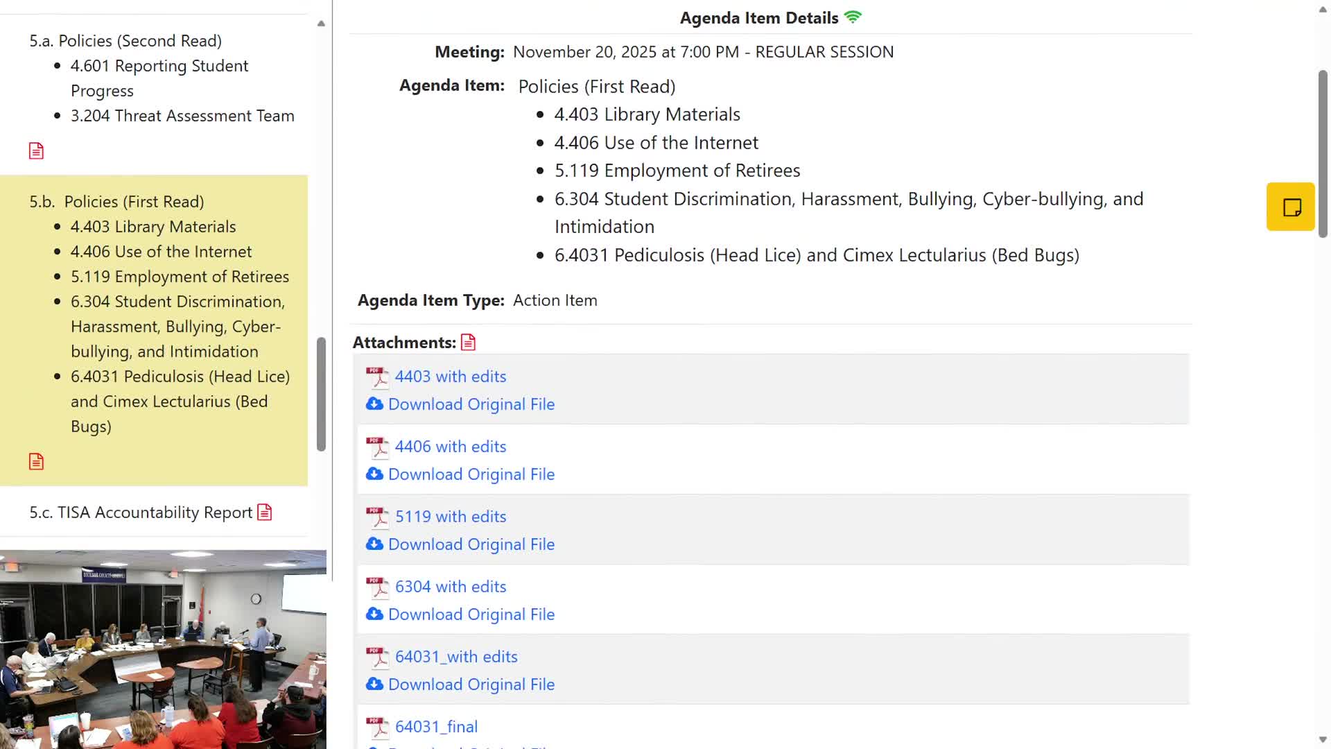 The Dickson County Board of Education on Nov. 20 approved a change to student health policy 6.4031 to add bed‑bug treatment and readmission procedures, voting to suspend normal rules so the policy could be adopted on both first and second readings at the same meeting.