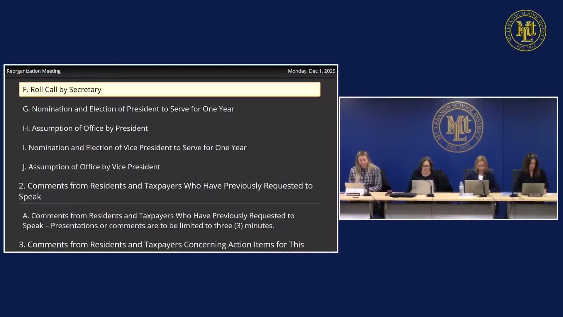 The Mount Lebanon School District Board of School Directors met on Monday, Dec. 1, 2025, in Room D205 at Mount Lebanon High School for its annual reorganization meeting, where newly elected members were sworn in and board leadership was chosen. Magisterial District Judge Hillary Wheatley administered oaths to newly elected members including Melinda Burdick, Becky Michelle Campanaro and Timothy P. Clocherty.