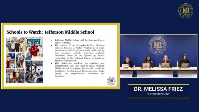 At the Dec. 8 meeting the Mount Lebanon superintendent reported Jefferson Middle School completed the designation process and will be named a 'School to Watch,' a recognition tied to academic excellence, developmental responsiveness and social equity under criteria set by the National Forum to Accelerate Middle School Reform.