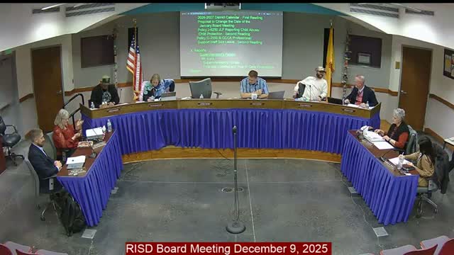At its regular meeting, the Roswell Independent Schools Board took several formal actions: it adopted revisions to Policy J6250 (JLF) to add neglect and ethical‑misconduct reporting and to specify reporting to the New Mexico Public Education Department consistent with House Bill 128; it approved updates to Policy G2250 clarifying sick‑leave allocations to match past practice and contract language; it advanced the 2026‑27 district calendar on first reading and noted a transition from PowerSchool to Synergy for the student information system; and it approved moving the January board meeting from Tuesday, Jan. 13 to Monday, Jan. 12 to avoid a major high‑school basketball event.