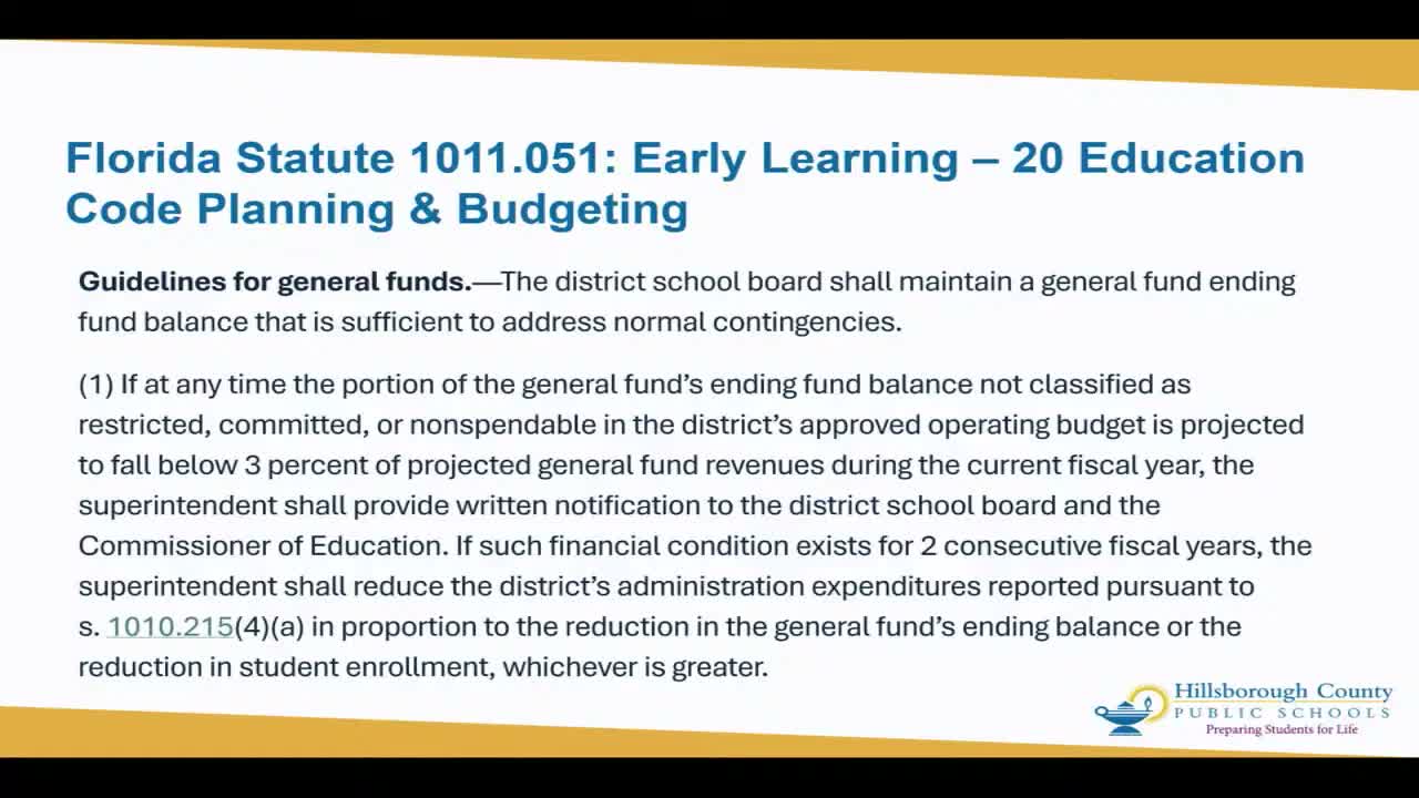 The Hillsborough County School Board heard a detailed presentation of a proposed fiscal planning policy that would set district reserve targets and outline procedures if reserves fall below statutory thresholds.
