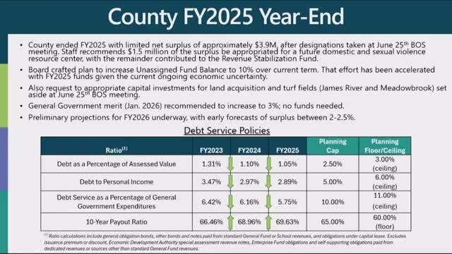 Chesterfield County finance staff reported the county closed fiscal year 2025 with a net surplus of approximately $3,900,000, and recommended the board appropriate $1,500,000 of that amount for a future domestic-violence resource center while placing the remainder into the county’s revenue stabilization fund.