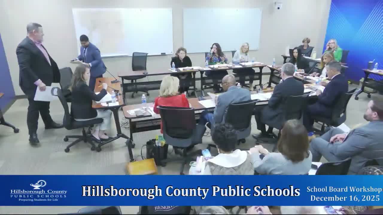The Hillsborough County School Board directed staff to prepare a revised bus-behavior and harassment policy (56.10.04) for public hearing after workshop discussion about driver safety, discipline responsibility and the effects of bus suspensions on special-education students.
