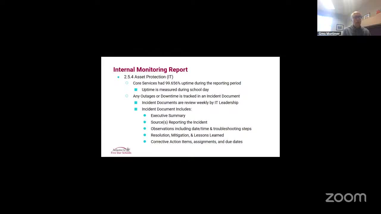 The report to the committee combined uptime metrics, incident narrative and suggested next steps; IT leaders asked the committee to consider the monitoring report and noted this is a high-priority operational area for the district.