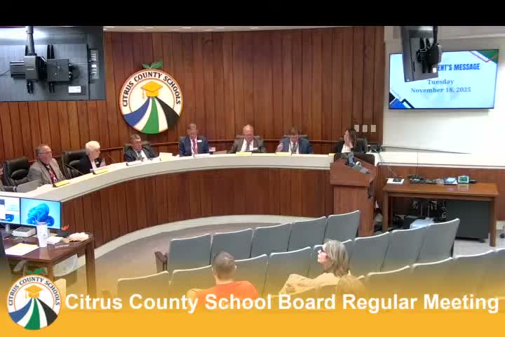 The Citrus County School Board completed a series of formal actions on Nov. 18, approving personnel recommendations, accepting a revised surplus list, increasing contracted funds for speech‑language services, adopting multiple policy updates, and concluding its organizational session with officer elections and appointment of legal counsel.