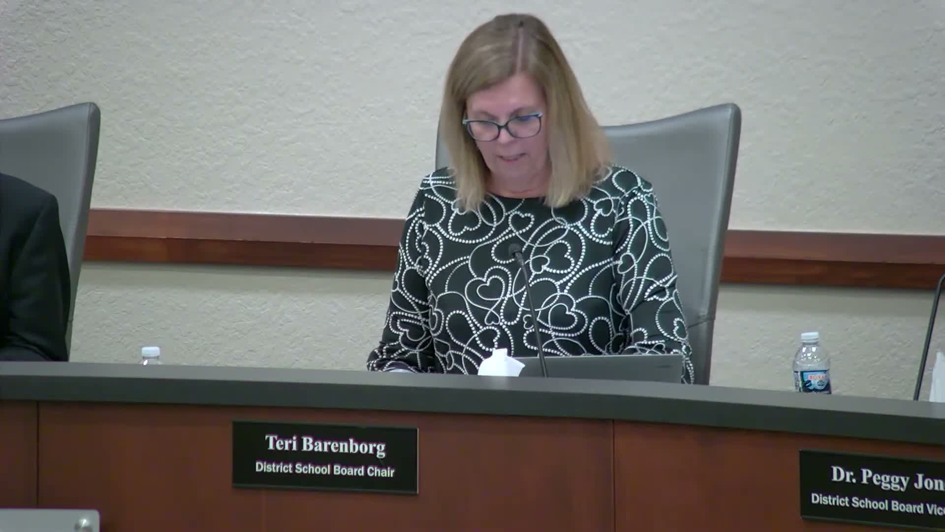 The board also voted to set a public hearing to advertise proposed updates to district policies — a package the agenda described as 55 policies (54 revised and one new) revised to comply with 2025 state legislation and Department of Education guidance. The board placed those proposed policy revisions on a public‑notice schedule and will hold a hearing before final adoption.