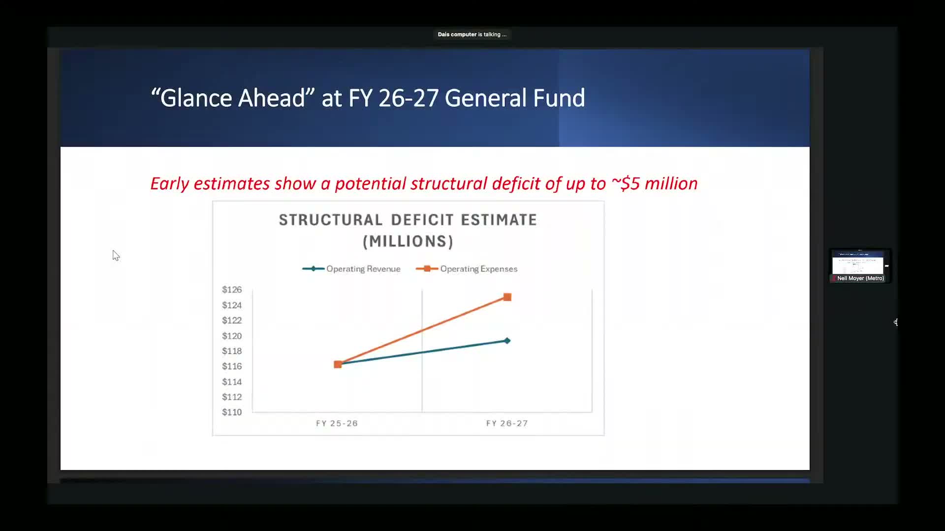 Lane County budget staff told the Board of County Commissioners on Dec. 16 that early estimates show a potential structural deficit in the 2026–27 general fund of up to $5,000,000. County Administrator Mr Mokurais and budget manager Christine Moody said the meeting was intended to begin planning, not to seek immediate direction.