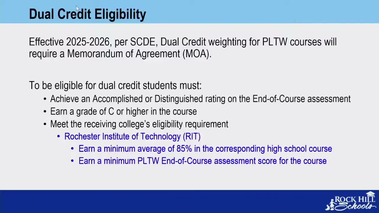The Rock Hill Schools board on Dec. 9 approved pursuing a memorandum of agreement with Rochester Institute of Technology that would allow high-school students enrolled in Project Lead The Way (PLTW) courses to purchase three college credits for $240 — markedly below typical tuition — provided students meet eligibility and assessment standards.