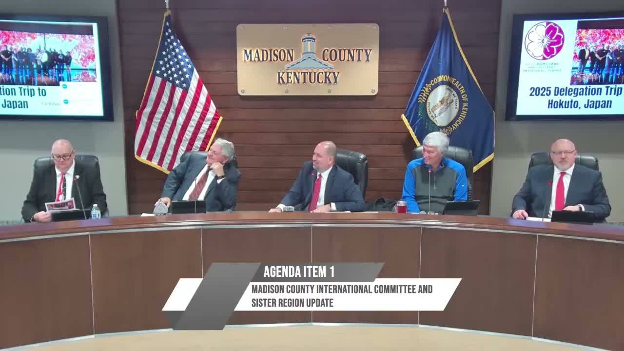 Court members noted educational programs already in place: a middle-school homestay program that will send 10 Madison County students to Japan next summer, and a high-school homestay partnership between Berea High School and Koryo High School that the presenters said has grown each year. Participants cited benefits for students and local artists and urged continued county support. Mayor Bruce Fraley led part of the adult delegation and was identified as head of the trip.