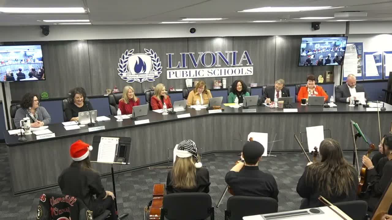 At the Dec. 15 Livonia Public Schools board meeting, students from Churchill High School’s Chamber Orchestra opened the session with a holiday performance, and district leaders used the occasion to highlight recent accomplishments across the music and extracurricular programs.