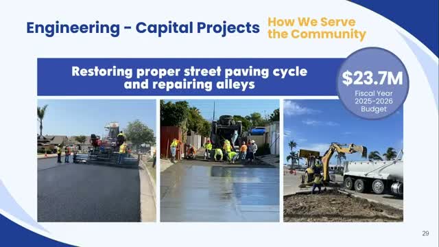 Public Works Director Michael Wolf told Oxnard City Council the department is prioritizing deferred maintenance, pavement preservation and parks upkeep after Measure E increased operating investment; council authorized about $24 million in paving this fiscal year and launched a $2 million Advanced Alley Maintenance Program.