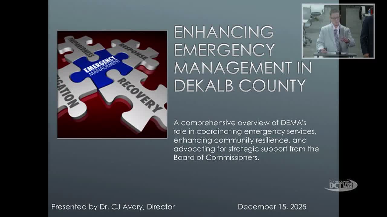 Dr. CJ Avery, DeKalb's new emergency-management director, told commissioners the agency will prioritize staffing, WebEOC modernization and intergovernmental coordination; she described warming-center activation triggers and early preparations for FIFA next summer.