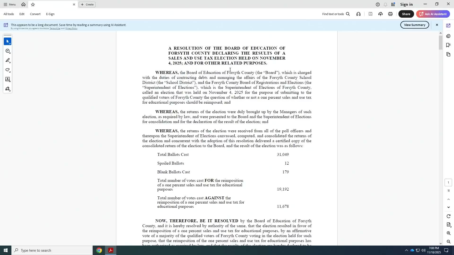 Dr. Josh Lowe read into the record a board resolution declaring the results of the Nov. 4, 2025 election on reimposing a 1% sales and use tax for educational purposes in Forsyth County. Board presenters reported that 62.19% of voters approved the reimposition and that the measure carried in every precinct (SEG 1336-1346, 1359-1363).