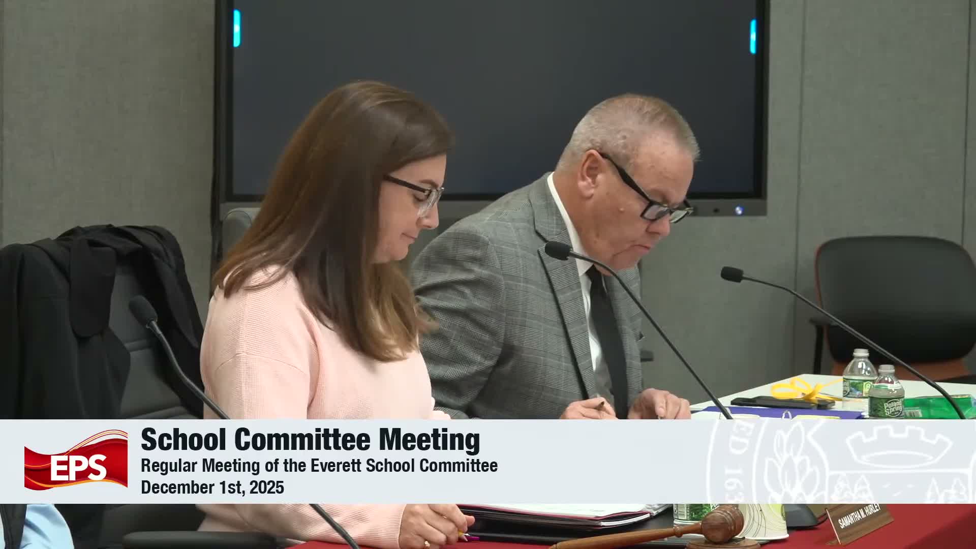 Superintendent William Hart told the Everett School Committee that teacher absenteeism is below the state average, that district CTE students are participating in UMass Boston's ADDAGE laptop program, and that the Healey-Driscoll administration released a statewide graduation framework earlier that day.