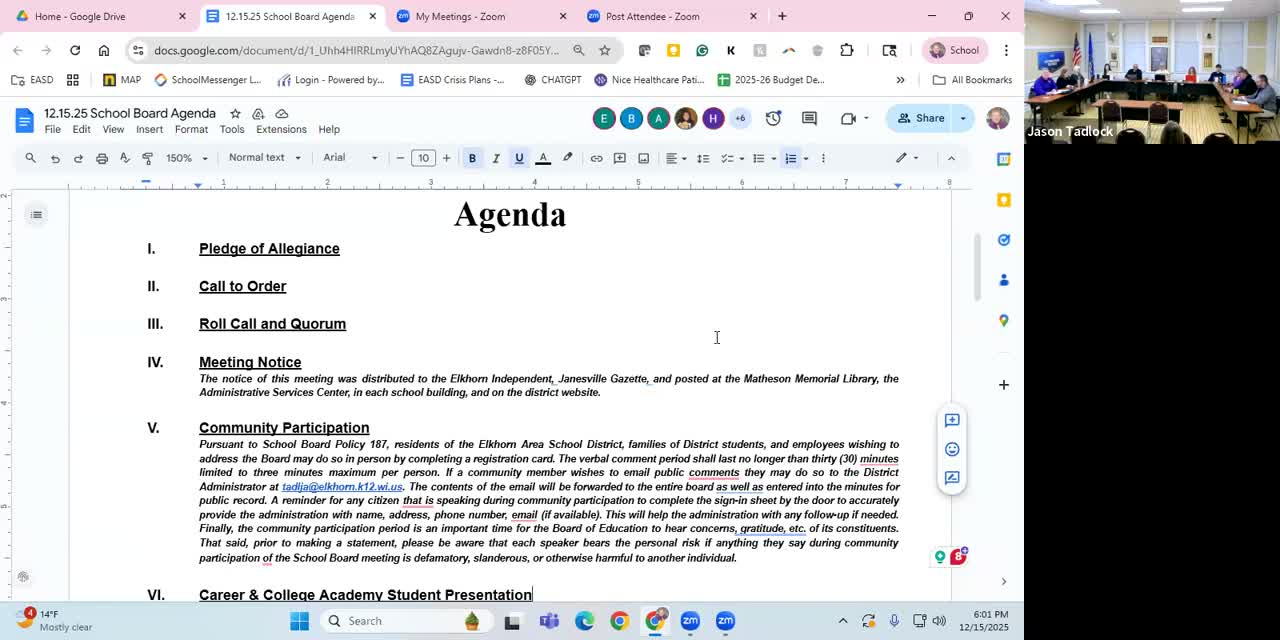 At its Dec. 15 meeting the Elkhorn Area School District highlighted students hired into part‑time positions through the Career and College Academy; seniors described duties as teacher’s aide and technical apprenticeships and noted they completed standard hiring steps.
