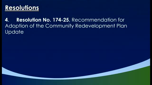 The City of Oviedo Community Redevelopment Agency voted Monday to adopt Resolution 174-25, updating the agency's community redevelopment plan to add a canopy walk/tower and public arts elements and to remove Wood Street and Godwin Street sidewalk projects; the measure passed by voice vote.