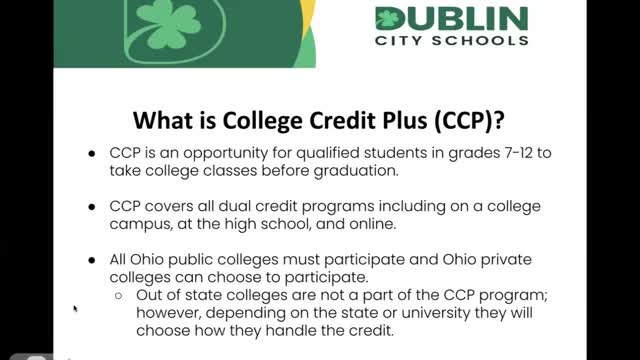 "College Credit Plus is our dual enrollment program offered through the state of Ohio," Patton said, explaining CCP lets students earn college and high‑school credit for the same class and is open to students in grades 7 through 12. He stressed that eligibility requires Ohio residency and college admission or placement: "there are certain requirements you have to meet, and it's gonna vary from school to school."