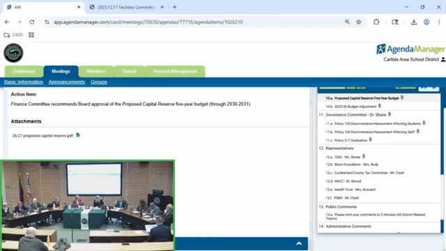 The Carlisle Area School District board approved a $2.815 million capital reserve spending plan for 2026–27 and adopted budget transfers to add roughly $729,410 in unanticipated state aid, allowing the district to avoid a planned draw from reserves.