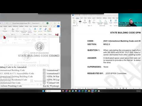The Washington State Building Code Council IBC technical advisory group discussed draft code language and an opinion on how to apply RCW 19.27.600 to childcare centers in existing buildings during its Dec. 4, 2025 meeting, but ultimately withdrew an earlier recommendation and tabled both the opinion and proposed 2024-code language for further work.