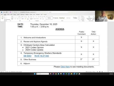 Members of the Washington Building Code Council’s IBC Technical Advisory Group met Dec. 18 to refine guidance on temporary emergency shelters and to decide what the building code should — and should not — regulate. The group agreed to focus the TAG’s work on hard‑sided, panelized sleeping cabins (including so‑called pallet shelters) and similar site‑assembled units, while leaving encampment siting and clustering to land‑use/zoning authorities.