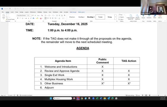 The Building Code Council workgroup voted to add the single-exit exception language (item 6) and to include a pointer from the fire code to the IBC appendix that governs single-exit multiplexes; final approval is scheduled after a user-note is finished.