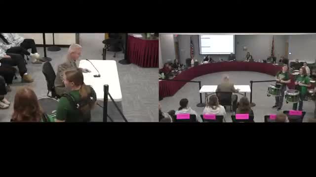 The board and district staff celebrated Kelly Walsh High School’s recent state championships, including the school’s first official state marching band title and the girls volleyball team’s back-to-back state championships. Band director Sarah Hansen and members of the Kelly Walsh marching band addressed the board and performed briefly; assistant coach Britney King introduced the volleyball players.