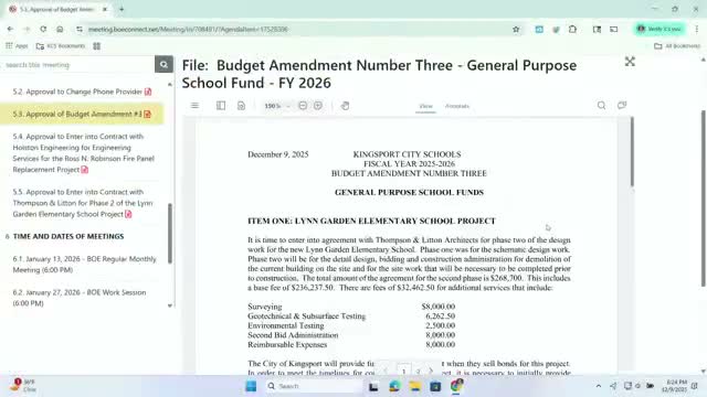 At the meeting David Fry walked the board through Budget Amendment No. 3, which contains two primary appropriations to fund architect agreements. The board approved appropriating $300,000 from the district’s unreserved fund balance to fund phase‑2 architectural services for the new Lynn Garden Elementary School with Thompson Litton. Fry said phase 1 covered schematic designs; phase 2 includes design development, bidding documents, demolition of an on-site community center and ancillary outbuildings, relocation of underground utilities near the current football field, sitework and contract administration. Fry estimated the phase‑2 contract at a lump sum of $268,700 and said the overall phase work could be part of a roughly $4,000,000 phase of the project; the city has indicated it will fund the demolition portion (estimated roughly $700,000–$1,000,000) and the district expects to be reimbursed from a later bond sale.