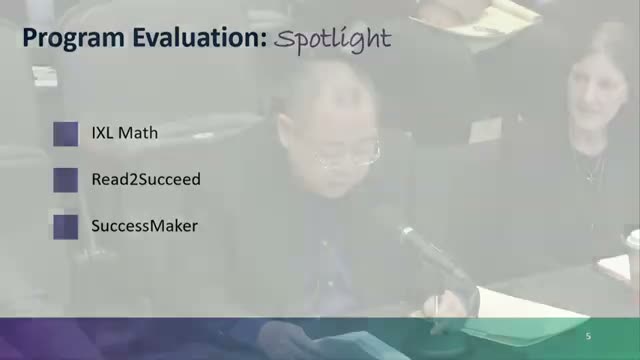 The superintendent's office said the district evaluated three programs in detail this year—IXL Math, Read to Succeed and SuccessMaker—and used a combination of internal and external methods to measure implementation and outcomes. "The IXL maths program is an online learning platform offering over 3,500 adaptive standards based mathematics skills," the research presentation said, and the evaluation focused on how implementation and teacher experience correlated with state assessment results.