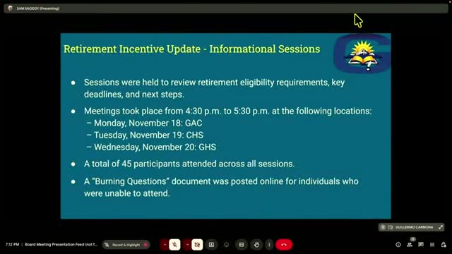 Board members expressed concern about the sizable number of special-education staff among those opting to take the incentive and asked for a staff survey to collect reasons for leaving. Administration said HR will issue a follow-up survey in January to gather employee feedback.