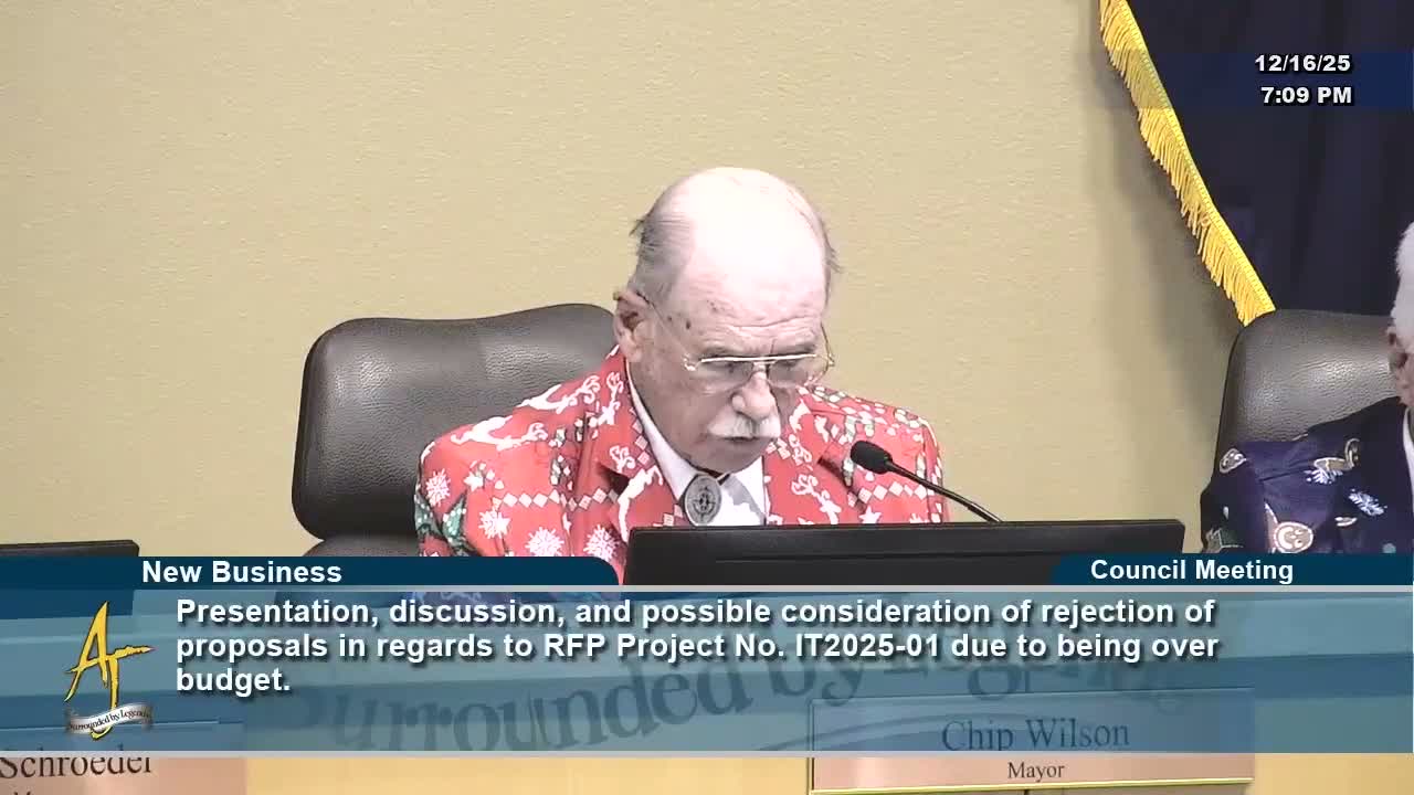 The council voted unanimously Dec. 16 to reject all bids for RFP IT2025-01 to complete a city fiber loop after nine proposals came in nearly $1 million above the $1.2 million budget; staff will rescope and rebid the project.