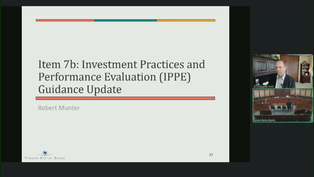 Robert Munter, presenting the investment‑practice and performance evaluation guidance (documents behind tab 7b), said staff updated the PRB schedule and guidance following statutory changes and feedback from systems. "We have all of the updates to the draft as a red line version as well as a clean version, so that's easier to see and read as to what it should look like in the final version," Munter told the board.