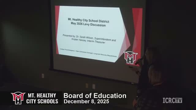 The Mt. Healthy City Schools board on Dec. 8 heard a presentation laying out two options the district could place on the May 2026 ballot to address an ongoing fiscal emergency: a continuing 5.95‑mill operating property levy or a 0.75% earned income tax.
