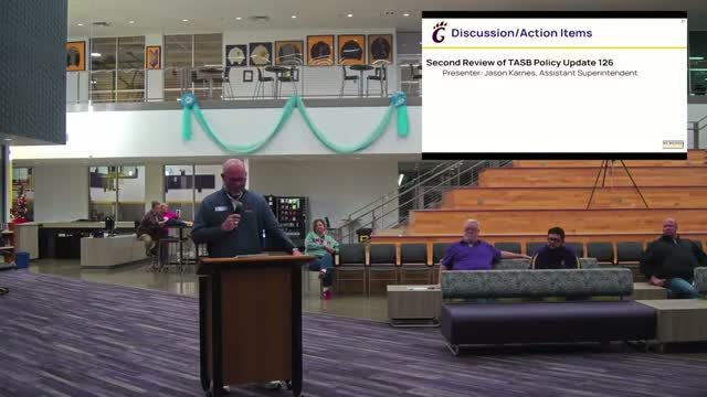Staff presented a second review of Policy Update 01/26, describing 28 local policy revisions to align with recent Texas legislation (including SB12, SB571, SB8, HB150 and HB1522) covering agenda timelines, grievance timelines, DEI contractor restrictions, AI training, reporting timelines, and facility signage; board action was not recorded in the transcript.