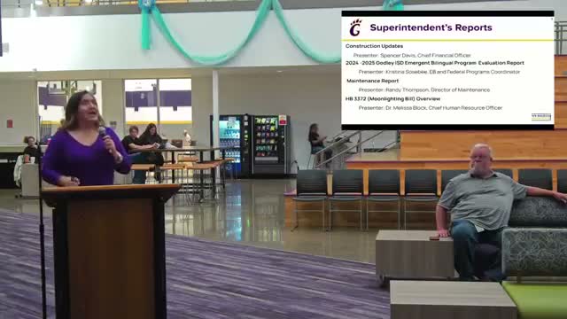 Cecilia, the district’s American bilingual and federal programs coordinator, told the Godley ISD Board that the district’s bilingual program evaluation shows continued enrollment growth among emergent bilingual students and measurable language-acquisition gains, and recommended additional staffing, targeted training and new devices to support testing and instruction.