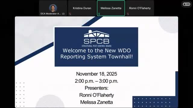 A presenter for the Structural Pest Control Board said the board’s new WDO (wood‑destroying organism) reporting system went live at 09:00 and walked participants through logging into Connect, filing activities and managing accounts. The session included a live demonstration, a question‑and‑answer period and troubleshooting guidance for users getting started.