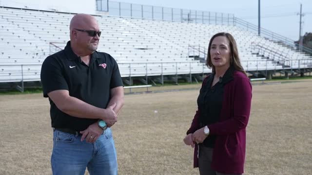 At the interview location, Knowlton described the seventh-grade center as "where we're standing today," noting it will include a new safe structure incorporated into the cafeteria, additional instructional classrooms and offices, upgraded athletic facilities with new coaches' offices and a training area, and a walking track around the athletic perimeter for student and community use.