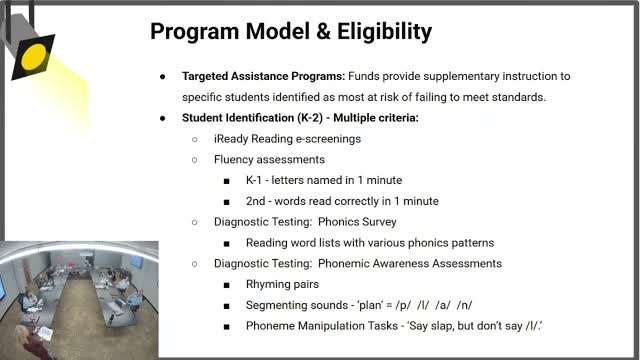 Presenters described two reading teachers who run eight small groups of six students each, with sessions of about 35 minutes per day. Staff said they use screeners and progress-monitoring to determine eligibility; i-Ready data was cited as a placement tool. The presenters described the program’s scope and sequence around the five pillars of reading — phonemic awareness, phonics, fluency, vocabulary and comprehension — and said they provide nightly take-home bags and materials with guidance so parents can support learning at home.