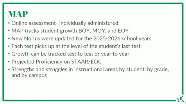 Jennifer Price reviewed MAP (Measures of Academic Progress), an adaptive online assessment administered three times per year to help monitor growth and target interventions. She noted the district moved to a new norming cycle this year and emphasized family reports and campus-level disaggregation of data to inform instructional decisions. Price also explained the logistical impacts of device availability in K–2 classrooms — which required extended administration windows at some campuses this fall.