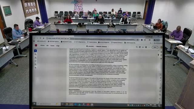 Board members previously had multiple detailed work sessions with the consultants and asked staff for additional data during that review process; administration said the recommendation reflects that iterative work. The approved option will guide kindergarten-through-fifth-grade attendance boundaries for the next transition period and staff said they will communicate specifics to affected families and principals as implementation proceeds.
