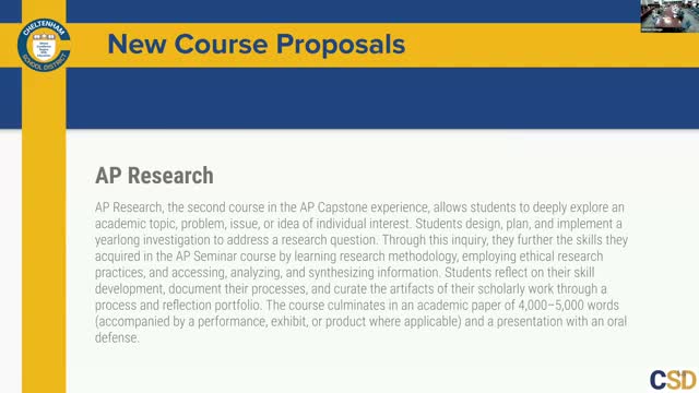 Cheltenham administrators told the Educational Affairs Committee they intend to expand advanced and experiential offerings by proposing AP Research, creating an honors Environmental Science to accompany a proposed ninth-grade requirement, and formalizing a two-part internship experience.